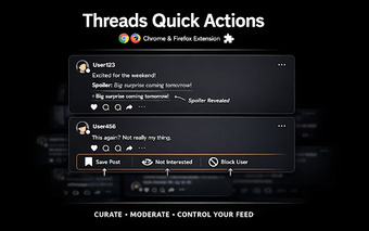 Ekstensi ini memberikan kontrol yang lebih baik bagi pengguna dengan akses cepat ke fungsi penting. Setiap kali pos baru dan komentar dimuat secara dinamis, kontrol ini tetap tersedia, memastikan bahwa pengguna dapat melakukan tindakan dengan hanya satu klik. Threads Quick Actions dirancang untuk memberikan pengalaman pengguna yang lebih bersih dan efisien dalam pengelolaan feed harian.